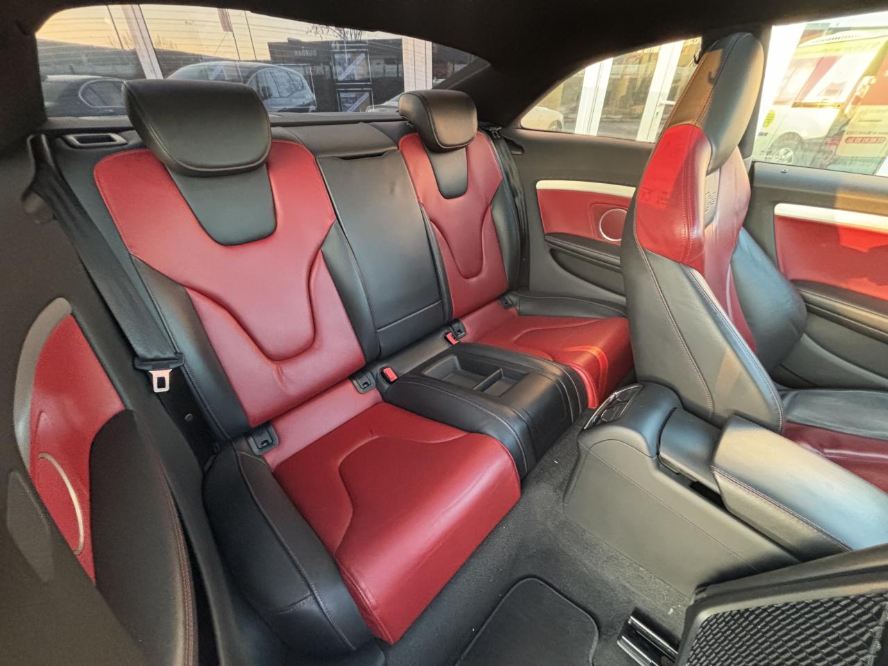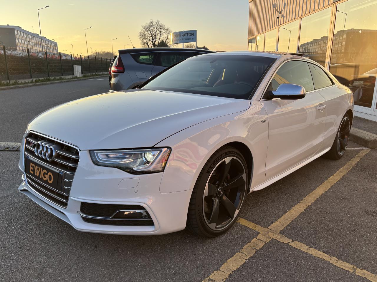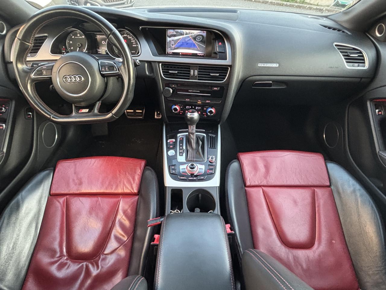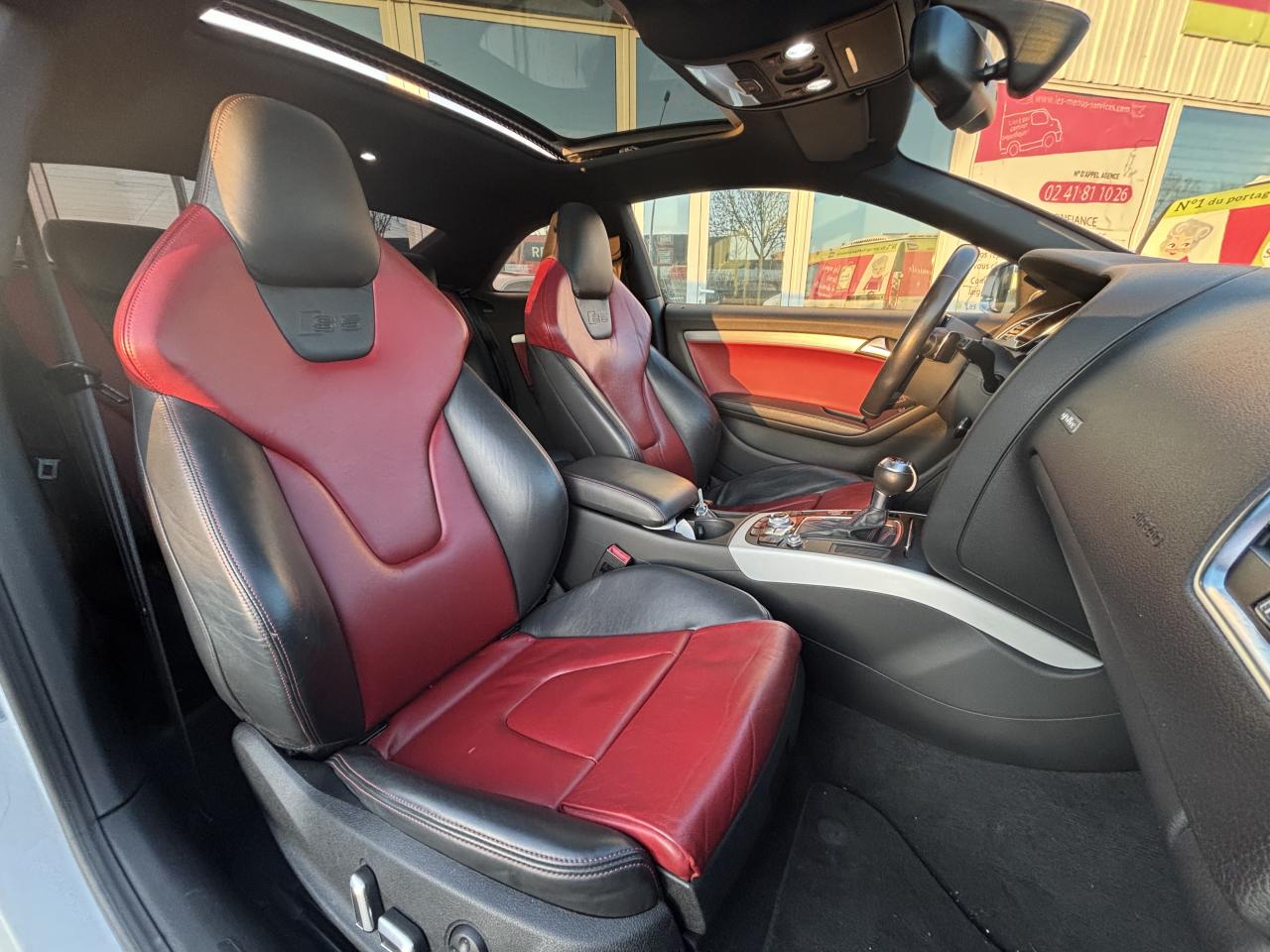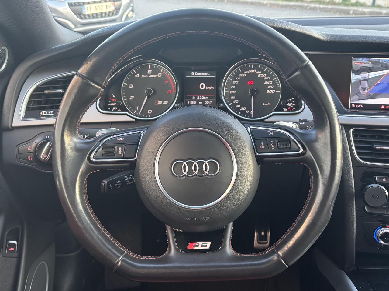 Accoudoir central avant avec vide-pochesAdvanced Key : système d'autorisation d'accès et de démarrage main libreAirbags latérauxAntipatinage électronique ASRApplications décoratives en aluminium brossé mat sur les contre-portes, les garnitures latérales à l'arrière ainsi que sur la console centraleAudi Hold AssistBecquet arrière intégré au couvercle de coffreBlocage électronique de différentiel (EDS)Calandre Singleframe gris titane à grille verticale chroméeCapot de coffre à ouverture automatique lors du déverrouillage du coffre par la télécommande, par la touche située sur la portière ou par actionnement de la touche douce sur le capot de coffre. Fermeture manuelleChâssis sport S avec suspension et amortisseurs plus fermes pour un contact plus direct avec la chaussée et une conduite sportive ; incluant jambes de force en dôme, essieu avant allégé à 5 bras avec essieu radial virtuel, barre stabilisatrice tubulaire ; essiCiel de pavillon en tissu, selon la couleur choisie, argent lunaire ou noirClimatisation automatique Confort Plus 3 zones à fonctionnalités étendues et affi chage numériqueContrôle de pression des pneus : vérifie durant la marche la pression de chacune des rouesCric, rangé dans le coffreDétecteur de pluie et allumage automatique des projecteursDossier des sièges arrière rabattable séparément, avec déverrouillage à distance des dossiers depuis le coffreEntourages de vitre en aluminium, revêtement noir brillant sur les montants de pavillon centraux et les vitres de custode arrièreFrein de stationnement électromécanique : comprend la fonction de frein de stationnement à l'arrêt, assistance de démarrage avec désactivation automatique lors du démarrage et fonction de freinage d'urgence sur les quatre rouesGPS PlusIndicateur de température extérieure dans le système d'information du conducteur ; en cas de températures inférieures à +5 °C, un cristal de glace apparaît sur l'afficheur, avertissant de la possibilité de verglasInstrumentation, avec éclairage réglable, compteur de vitesse électronique avec compteur kilométrique et compteur journalier, compte-tours, horloge, affichage de la température du liquide de refroidissement et jauge de carburantLave-glace, deux vitesses, 4 réglages d'intermittence, balayage coup par coup et lavage-balayage automatiqueOrdinateur de bord couleur et système de contrôle autocheck (incluant programme efficiency)Préparation téléphone 2 W bi-bande (D et E), sans support pour adaptateur ni antenne de toit, commande sur volant multifonction, mains libres, interface BluetoothProgramme électronique de stabilisation ESP : relie ABS, EBV, ASR et EDS avec ses propres capteurs et compare les données de conduite avec les données de référence ; assure davantage de stabilité par freinage ciblé des roues et intervention dans la geQuattro : transmission intégrale permanente avec répartition asymétrique et dynamique de coupleRéglage d'appuis lombaires électriques sur 4 plans pour sièges avantRégulateur de vitesse électronique actif dès 30 km/hRétroviseur intérieur jour/nuit automatique incluant une bande grise en haut du pare-briseRoues de secours temporaireServotronic : direction assistée asservie à la vitesseSièges avant électriques pour longueur, hauteur, inclinaison d'assise et de dossierSièges Sport à l'avantStyle aluminium, dans l'habitacle sur les commutateurs d'éclairage, la commande de la climatisation, les diffuseurs d'air ainsi qu'autour du soufflet de levier de vitessesVolant airbag Sport 3 branches multifonction avec emblème S5 et palettes de changement de vitesses commandé, réglable en hauteur et en profondeur, incluant pommeau et soufflet de levier de vitesses en cuirXénon Plus incluant réglage automatique du site des phares, feux diurnes par bandeau de LED et lave-phares, feux arrière à LED pour feux de position et de stop