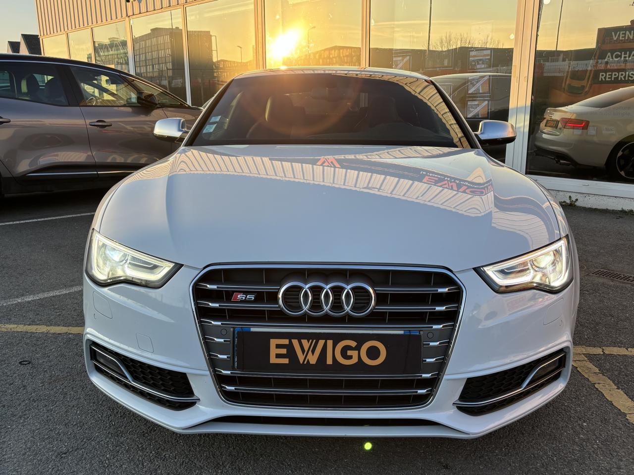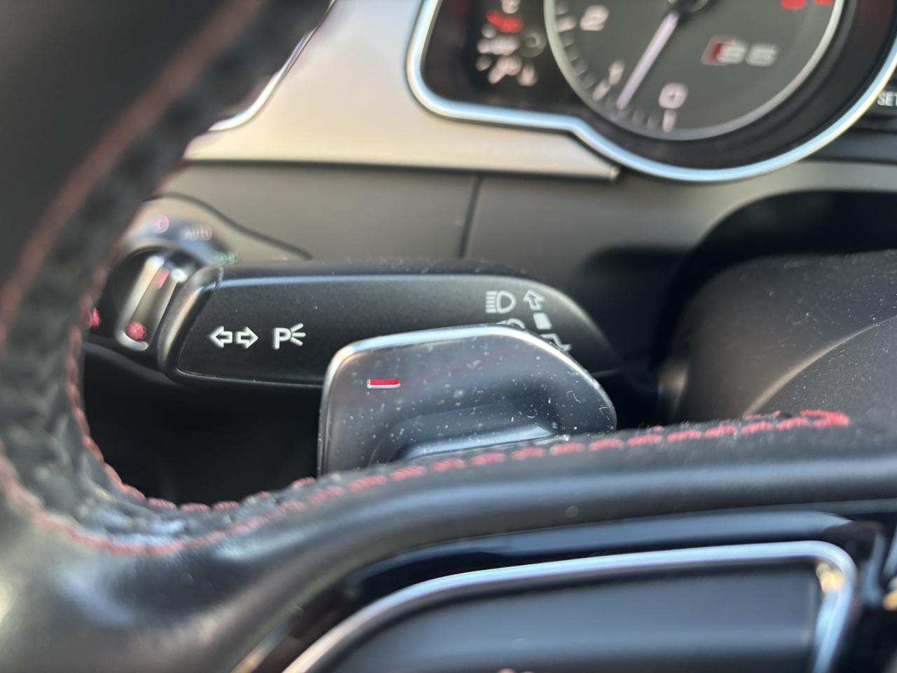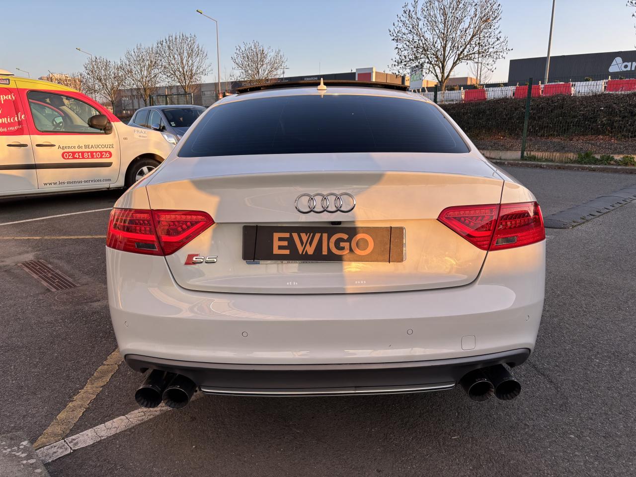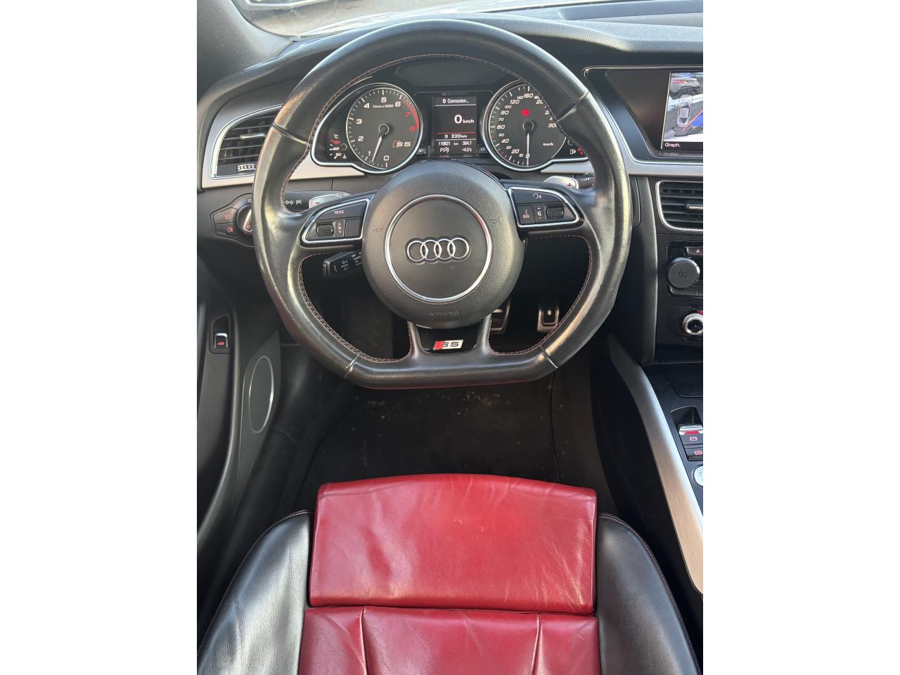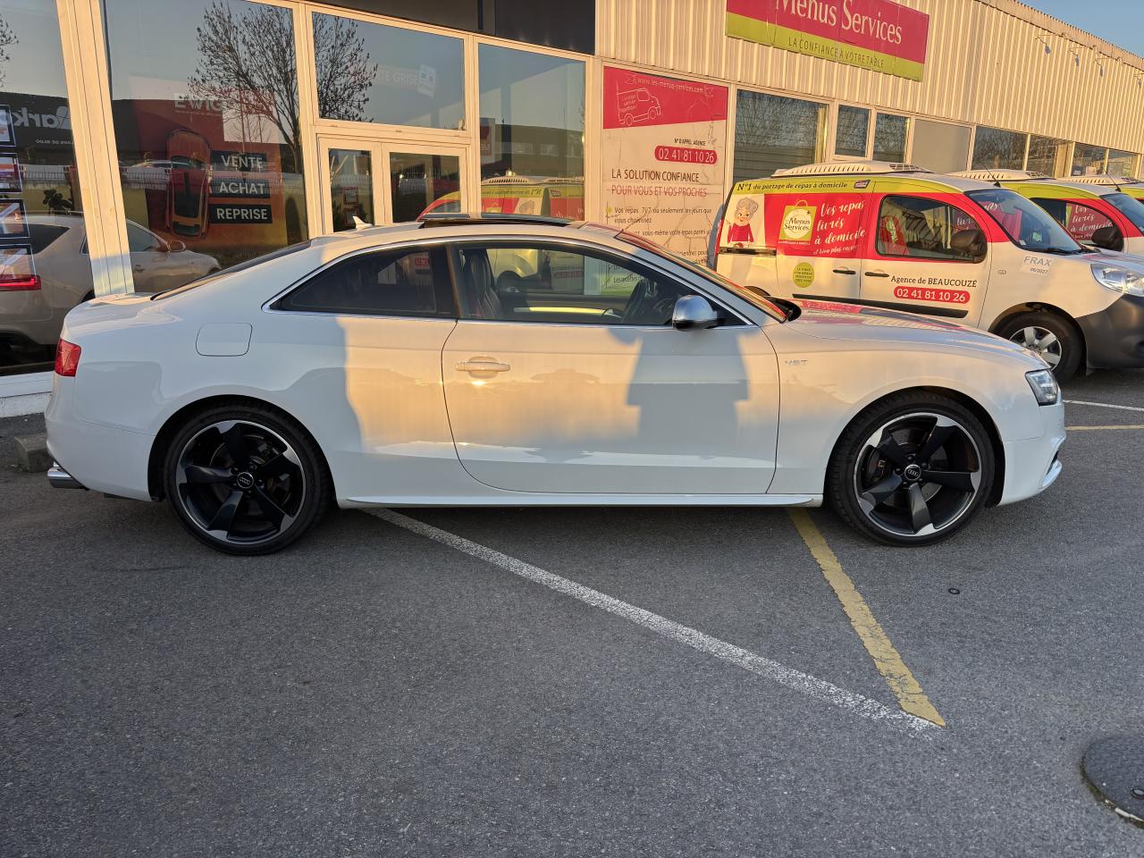 Accoudoir central avant avec vide-pochesAdvanced Key : système d'autorisation d'accès et de démarrage main libreAirbags latérauxAntipatinage électronique ASRApplications décoratives en aluminium brossé mat sur les contre-portes, les garnitures latérales à l'arrière ainsi que sur la console centraleAudi Hold AssistBecquet arrière intégré au couvercle de coffreBlocage électronique de différentiel (EDS)Calandre Singleframe gris titane à grille verticale chroméeCapot de coffre à ouverture automatique lors du déverrouillage du coffre par la télécommande, par la touche située sur la portière ou par actionnement de la touche douce sur le capot de coffre. Fermeture manuelleChâssis sport S avec suspension et amortisseurs plus fermes pour un contact plus direct avec la chaussée et une conduite sportive ; incluant jambes de force en dôme, essieu avant allégé à 5 bras avec essieu radial virtuel, barre stabilisatrice tubulaire ; essiCiel de pavillon en tissu, selon la couleur choisie, argent lunaire ou noirClimatisation automatique Confort Plus 3 zones à fonctionnalités étendues et affi chage numériqueContrôle de pression des pneus : vérifie durant la marche la pression de chacune des rouesCric, rangé dans le coffreDétecteur de pluie et allumage automatique des projecteursDossier des sièges arrière rabattable séparément, avec déverrouillage à distance des dossiers depuis le coffreEntourages de vitre en aluminium, revêtement noir brillant sur les montants de pavillon centraux et les vitres de custode arrièreFrein de stationnement électromécanique : comprend la fonction de frein de stationnement à l'arrêt, assistance de démarrage avec désactivation automatique lors du démarrage et fonction de freinage d'urgence sur les quatre rouesGPS PlusIndicateur de température extérieure dans le système d'information du conducteur ; en cas de températures inférieures à +5 °C, un cristal de glace apparaît sur l'afficheur, avertissant de la possibilité de verglasInstrumentation, avec éclairage réglable, compteur de vitesse électronique avec compteur kilométrique et compteur journalier, compte-tours, horloge, affichage de la température du liquide de refroidissement et jauge de carburantLave-glace, deux vitesses, 4 réglages d'intermittence, balayage coup par coup et lavage-balayage automatiqueOrdinateur de bord couleur et système de contrôle autocheck (incluant programme efficiency)Préparation téléphone 2 W bi-bande (D et E), sans support pour adaptateur ni antenne de toit, commande sur volant multifonction, mains libres, interface BluetoothProgramme électronique de stabilisation ESP : relie ABS, EBV, ASR et EDS avec ses propres capteurs et compare les données de conduite avec les données de référence ; assure davantage de stabilité par freinage ciblé des roues et intervention dans la geQuattro : transmission intégrale permanente avec répartition asymétrique et dynamique de coupleRéglage d'appuis lombaires électriques sur 4 plans pour sièges avantRégulateur de vitesse électronique actif dès 30 km/hRétroviseur intérieur jour/nuit automatique incluant une bande grise en haut du pare-briseRoues de secours temporaireServotronic : direction assistée asservie à la vitesseSièges avant électriques pour longueur, hauteur, inclinaison d'assise et de dossierSièges Sport à l'avantStyle aluminium, dans l'habitacle sur les commutateurs d'éclairage, la commande de la climatisation, les diffuseurs d'air ainsi qu'autour du soufflet de levier de vitessesVolant airbag Sport 3 branches multifonction avec emblème S5 et palettes de changement de vitesses commandé, réglable en hauteur et en profondeur, incluant pommeau et soufflet de levier de vitesses en cuirXénon Plus incluant réglage automatique du site des phares, feux diurnes par bandeau de LED et lave-phares, feux arrière à LED pour feux de position et de stop