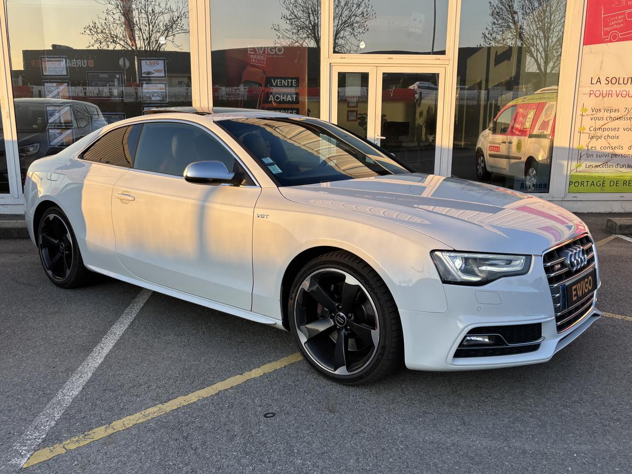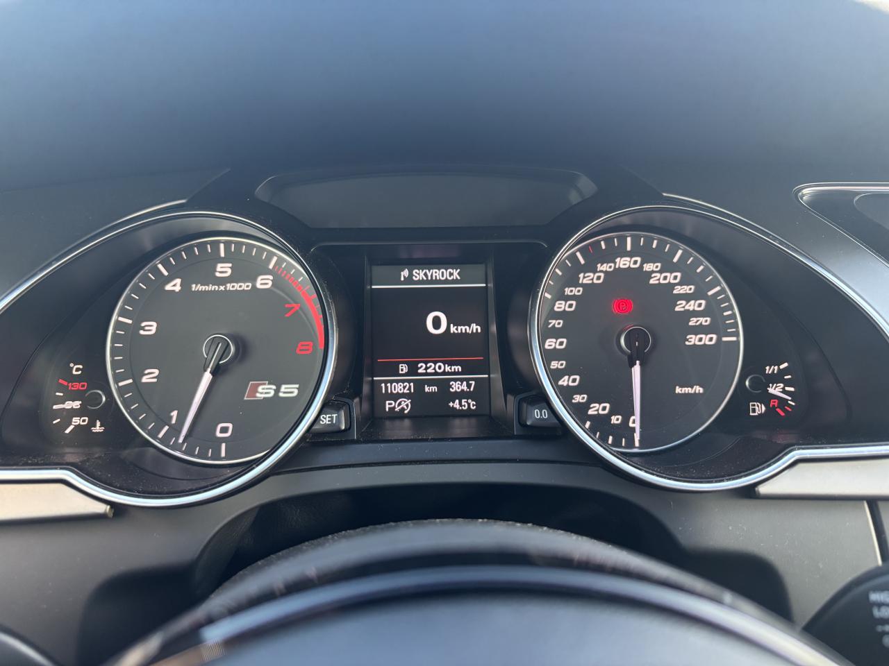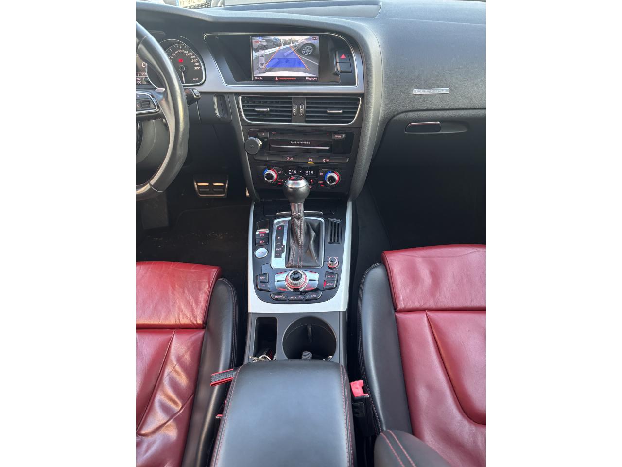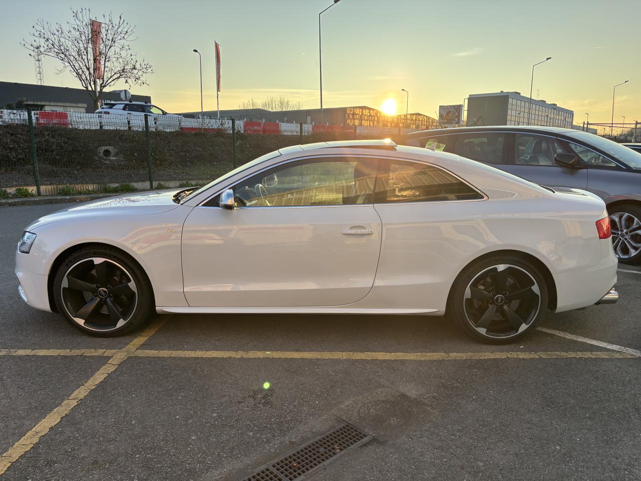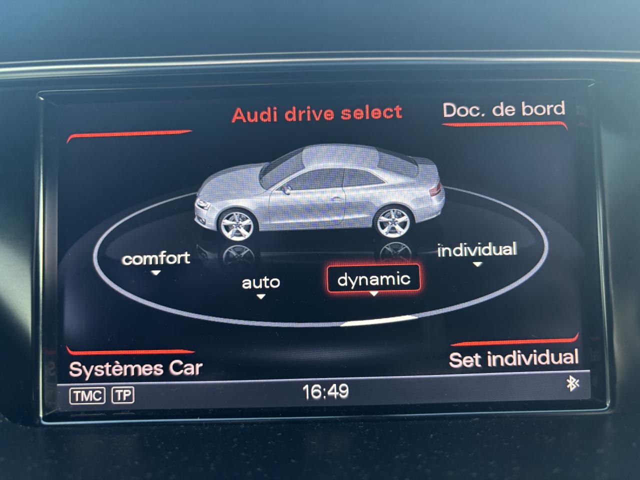 Accoudoir central avant avec vide-pochesAdvanced Key : système d'autorisation d'accès et de démarrage main libreAirbags latérauxAntipatinage électronique ASRApplications décoratives en aluminium brossé mat sur les contre-portes, les garnitures latérales à l'arrière ainsi que sur la console centraleAudi Hold AssistBecquet arrière intégré au couvercle de coffreBlocage électronique de différentiel (EDS)Calandre Singleframe gris titane à grille verticale chroméeCapot de coffre à ouverture automatique lors du déverrouillage du coffre par la télécommande, par la touche située sur la portière ou par actionnement de la touche douce sur le capot de coffre. Fermeture manuelleChâssis sport S avec suspension et amortisseurs plus fermes pour un contact plus direct avec la chaussée et une conduite sportive ; incluant jambes de force en dôme, essieu avant allégé à 5 bras avec essieu radial virtuel, barre stabilisatrice tubulaire ; essiCiel de pavillon en tissu, selon la couleur choisie, argent lunaire ou noirClimatisation automatique Confort Plus 3 zones à fonctionnalités étendues et affi chage numériqueContrôle de pression des pneus : vérifie durant la marche la pression de chacune des rouesCric, rangé dans le coffreDétecteur de pluie et allumage automatique des projecteursDossier des sièges arrière rabattable séparément, avec déverrouillage à distance des dossiers depuis le coffreEntourages de vitre en aluminium, revêtement noir brillant sur les montants de pavillon centraux et les vitres de custode arrièreFrein de stationnement électromécanique : comprend la fonction de frein de stationnement à l'arrêt, assistance de démarrage avec désactivation automatique lors du démarrage et fonction de freinage d'urgence sur les quatre rouesGPS PlusIndicateur de température extérieure dans le système d'information du conducteur ; en cas de températures inférieures à +5 °C, un cristal de glace apparaît sur l'afficheur, avertissant de la possibilité de verglasInstrumentation, avec éclairage réglable, compteur de vitesse électronique avec compteur kilométrique et compteur journalier, compte-tours, horloge, affichage de la température du liquide de refroidissement et jauge de carburantLave-glace, deux vitesses, 4 réglages d'intermittence, balayage coup par coup et lavage-balayage automatiqueOrdinateur de bord couleur et système de contrôle autocheck (incluant programme efficiency)Préparation téléphone 2 W bi-bande (D et E), sans support pour adaptateur ni antenne de toit, commande sur volant multifonction, mains libres, interface BluetoothProgramme électronique de stabilisation ESP : relie ABS, EBV, ASR et EDS avec ses propres capteurs et compare les données de conduite avec les données de référence ; assure davantage de stabilité par freinage ciblé des roues et intervention dans la geQuattro : transmission intégrale permanente avec répartition asymétrique et dynamique de coupleRéglage d'appuis lombaires électriques sur 4 plans pour sièges avantRégulateur de vitesse électronique actif dès 30 km/hRétroviseur intérieur jour/nuit automatique incluant une bande grise en haut du pare-briseRoues de secours temporaireServotronic : direction assistée asservie à la vitesseSièges avant électriques pour longueur, hauteur, inclinaison d'assise et de dossierSièges Sport à l'avantStyle aluminium, dans l'habitacle sur les commutateurs d'éclairage, la commande de la climatisation, les diffuseurs d'air ainsi qu'autour du soufflet de levier de vitessesVolant airbag Sport 3 branches multifonction avec emblème S5 et palettes de changement de vitesses commandé, réglable en hauteur et en profondeur, incluant pommeau et soufflet de levier de vitesses en cuirXénon Plus incluant réglage automatique du site des phares, feux diurnes par bandeau de LED et lave-phares, feux arrière à LED pour feux de position et de stop